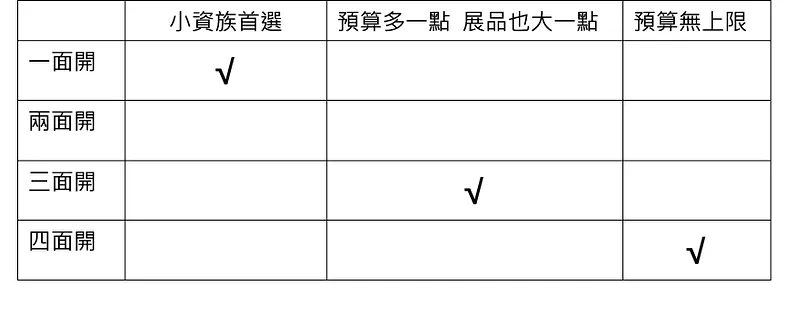 而參展除了考量攤位面積,攤位面開也很重要,不同形式的開法,也會影響人潮,而展覽攤位的形式有四種,分別為: